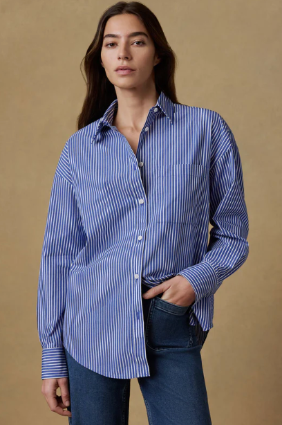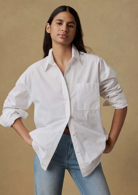 Crafted from 100% organic cotton poplin made in Turkey, this tightly woven fabric balances structure with a lightweight, breathable feel and a soft, lived-in hand. The relaxed, oversized button-up silhouette features a shirttail hem that adds length and coverage, making it easy to wear untucked or layered.